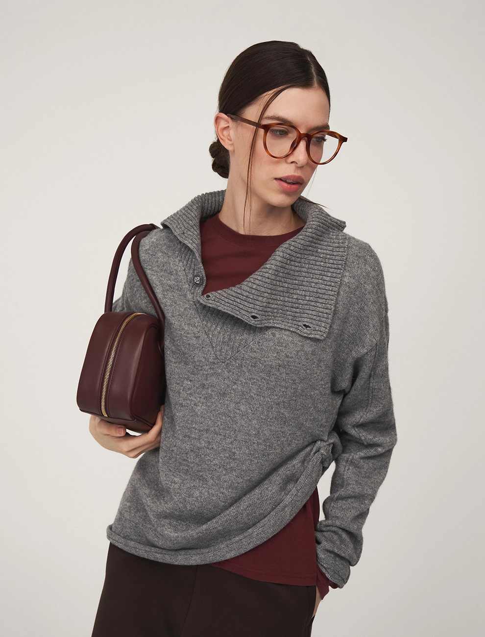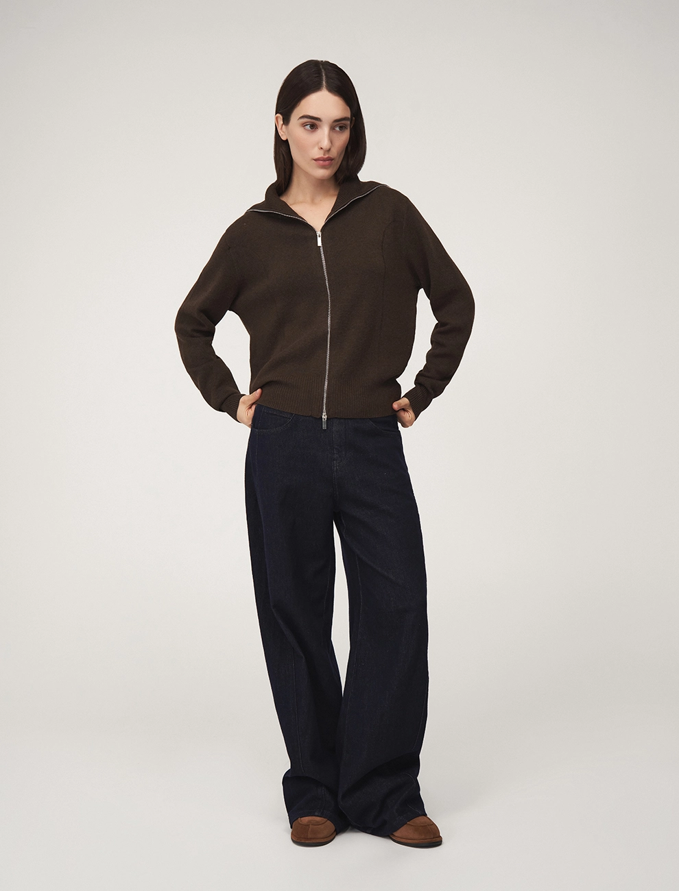 Брюки из джерси зауженного к низу силуэта. По поясу встроена эластичная резинка. По бокам врезные карманы с листочкой. Низ брюк — асимметричный. Сзади, с правой стороны — накладной карман. Выполнены из хлопка (60%), терилена и спандекса, что обеспечивает комфорт и долговечность. Представлены в черном и коричневом оттенке.