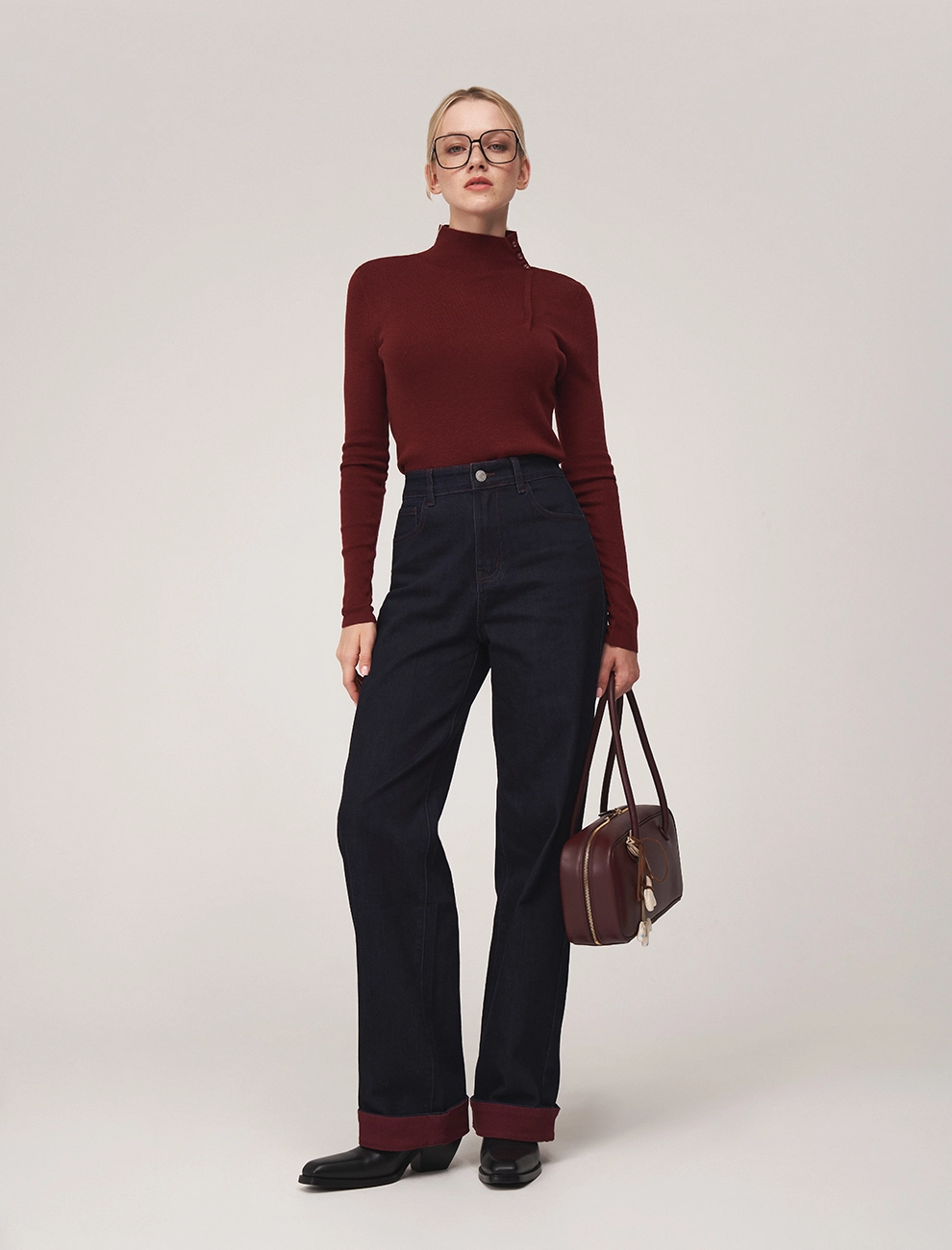 Джинсы прямого силуэта с посадкой на уровне талии. Спереди классический гульфик и застежка на молнию. По бокам врезные карманы. По поясу шлевки. Сзади кокетка и накладные карманы. Ткань верха из «сырого» денима. По низу подвороты в бордовом оттенке.