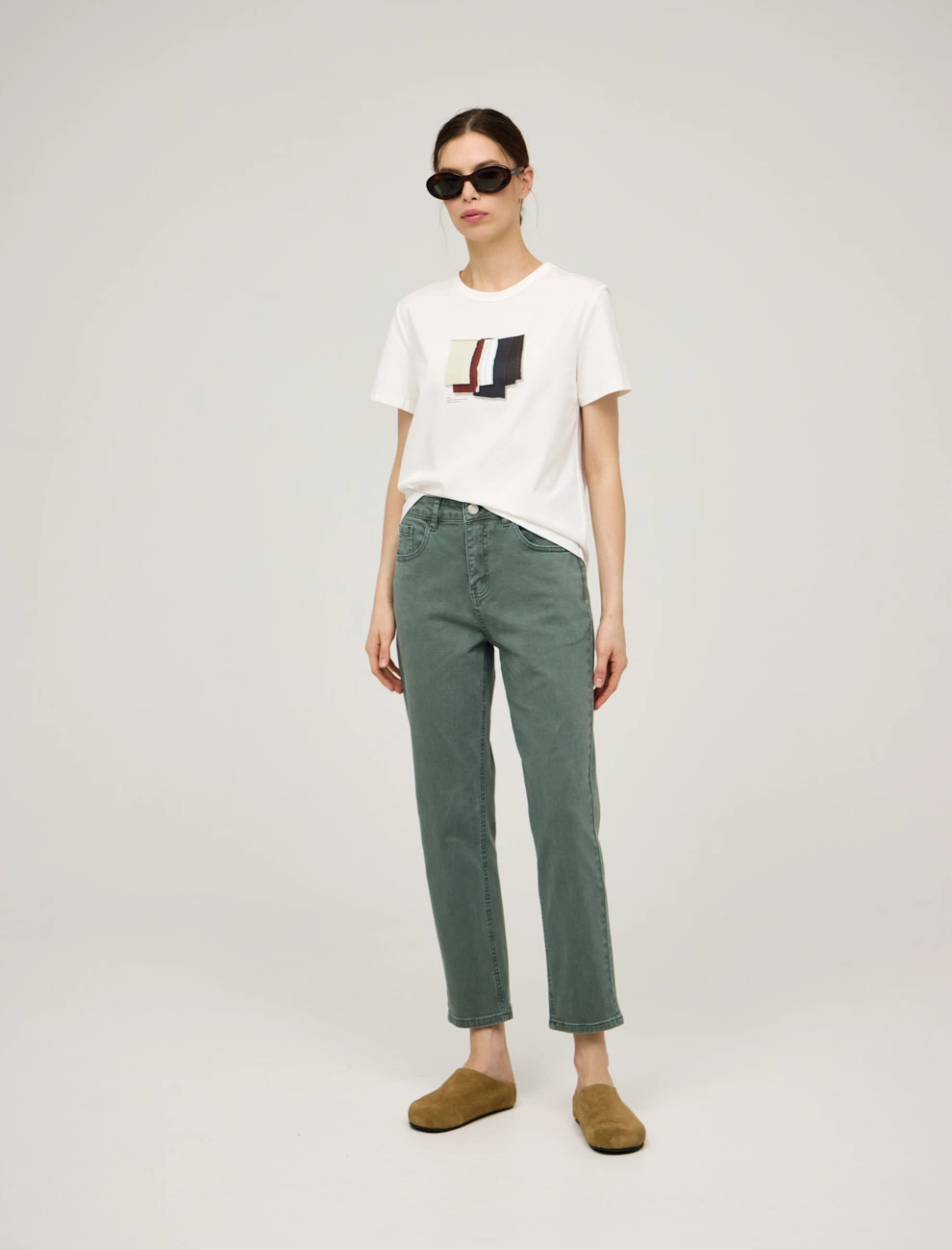 Джинсы зауженного к низу силуэта, укороченные, с посадкой на уровне талии. По поясу шлевки для ремня. По передней части изделия – классический гульфик, застежка на пуговицу и три кармана. Сзади кокетка, накладные карманы и брендированный патч HASS. Акцентной деталью изделия является мягкая равномерная варка. Выполнены из хлопка с добавлением спандекса, что обеспечивает комфорт и долговечность. Представлены в светло-сером и зеленом оттенках.