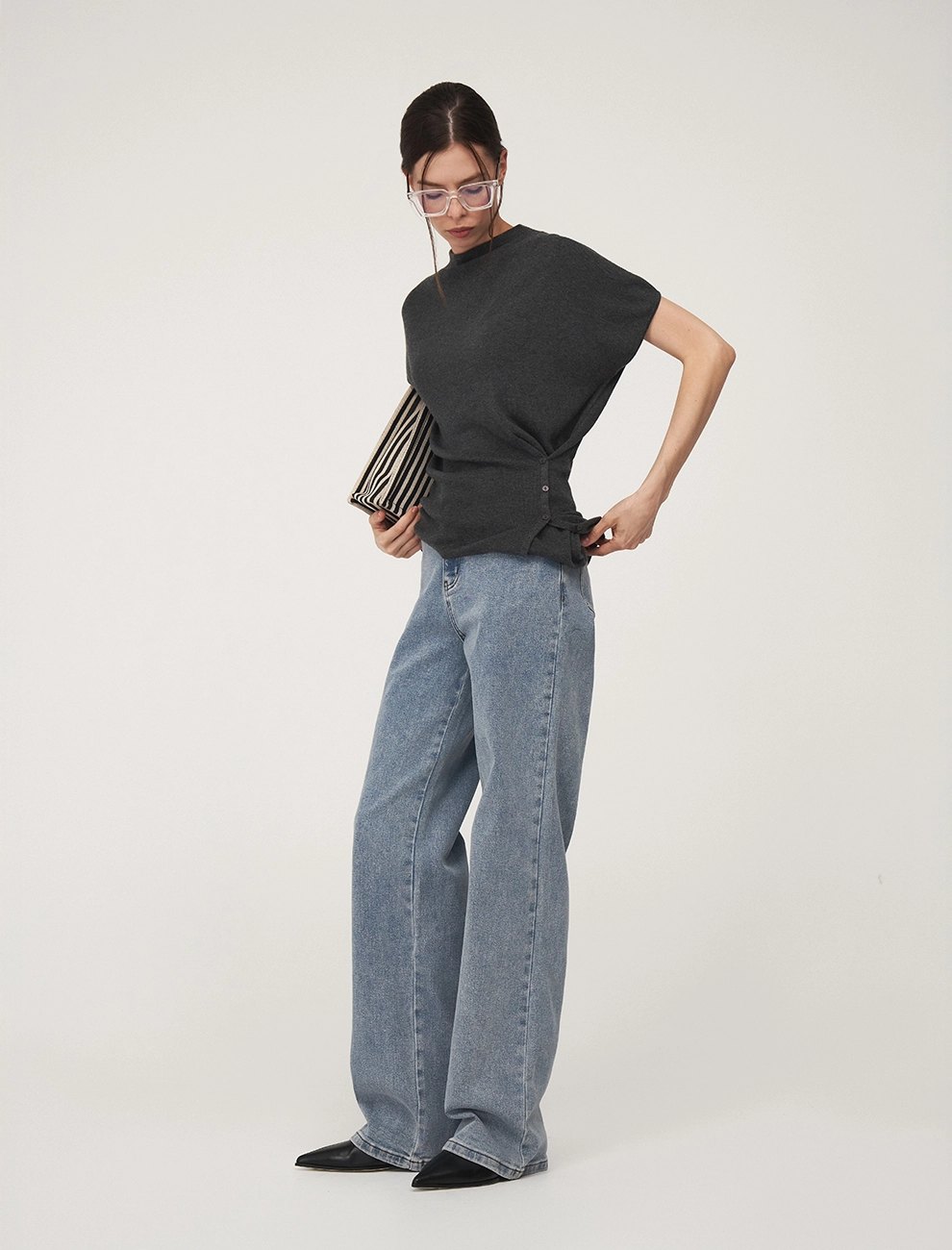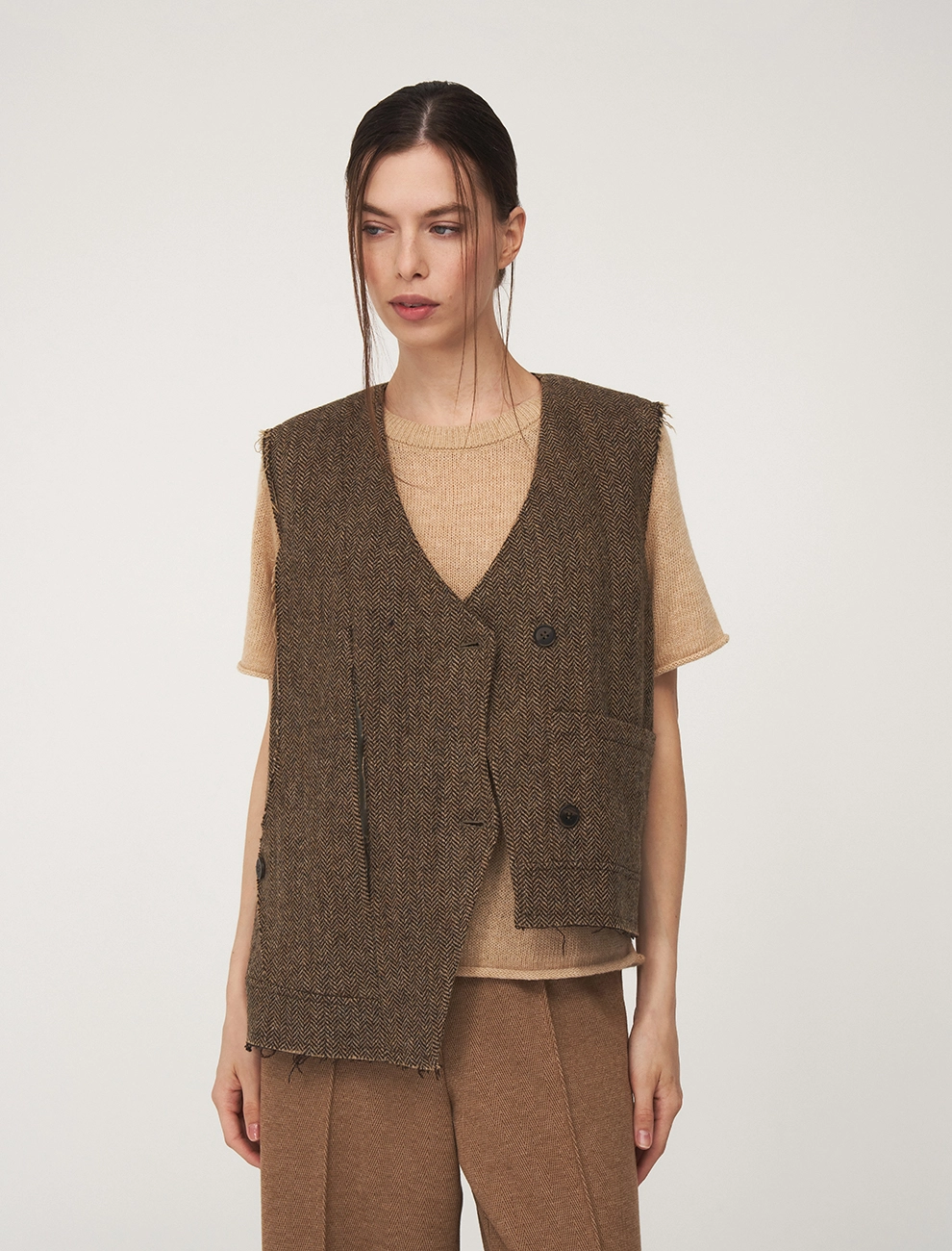 Вязаный джемпер регулярного силуэта с коротким цельнокроенным рукавом и воротником-стойкой. По передней части, снизу, с левой стороны – застежка на пуговицы для приталивания силуэта. Выполнен из хлопка и акрила с добавлением кашемира и шелка, что обеспечивает комфорт и тепло. Представлен в сером и коричневом оттенке.