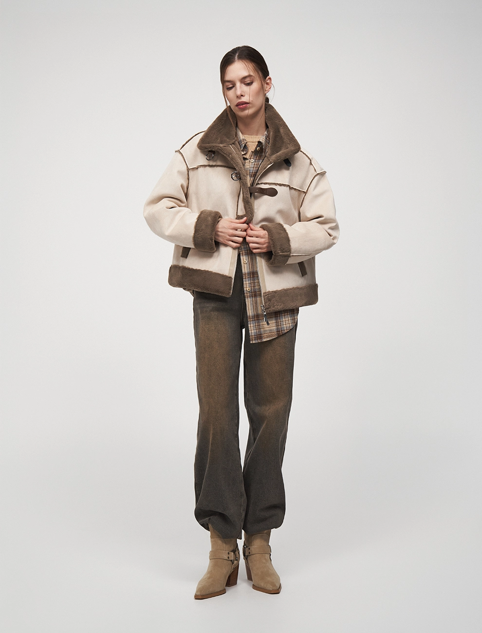 Дубленка oversize силуэта с воротником. Линия плеча спущена. По передней части изделия застежка на молнию. Планка воротника застегивается на хлястики. По плечам, пройме и на уровне груди эффект открытых срезов. На изнанке, по низу изделия и рукавов — имитация мягкого меха в коричневом оттенке. Выполнена из 100% полиакрила.