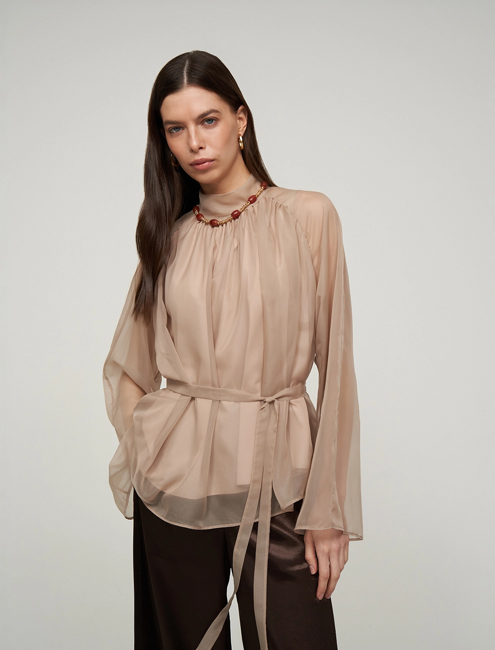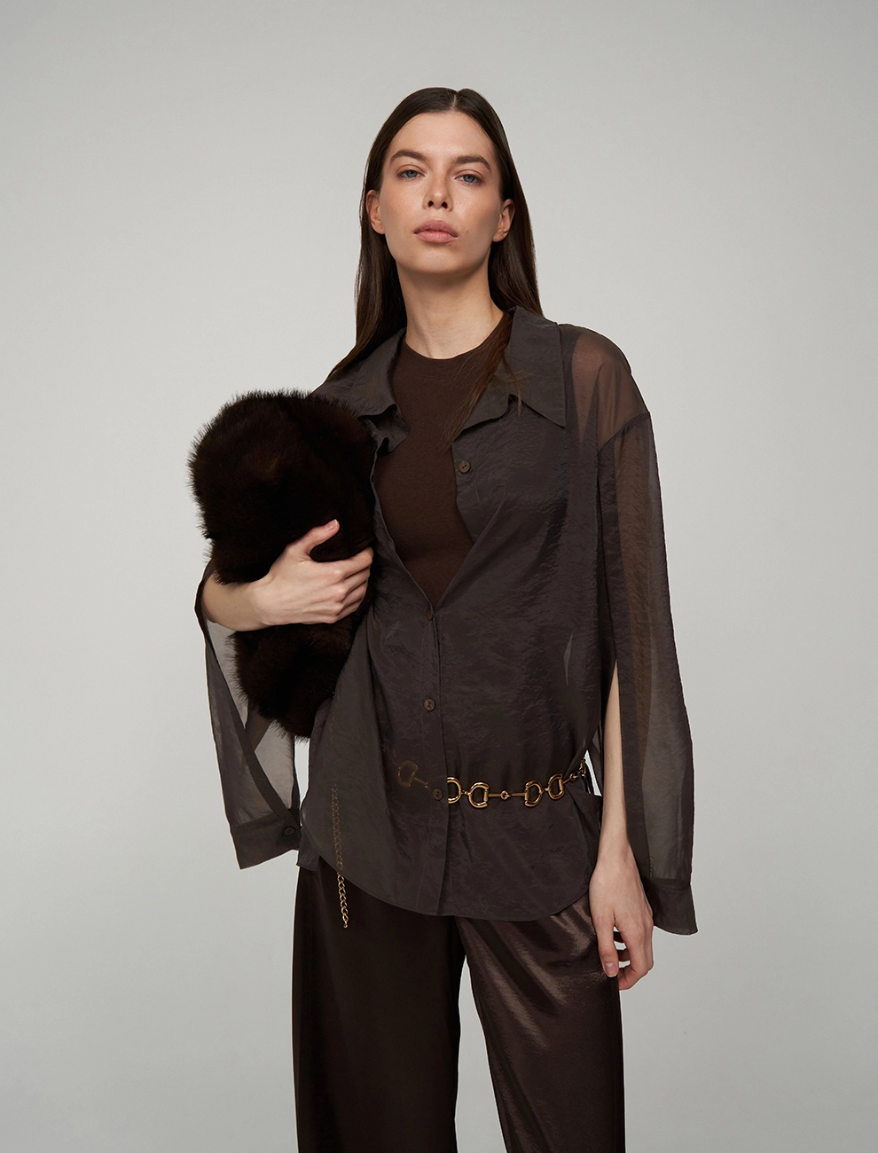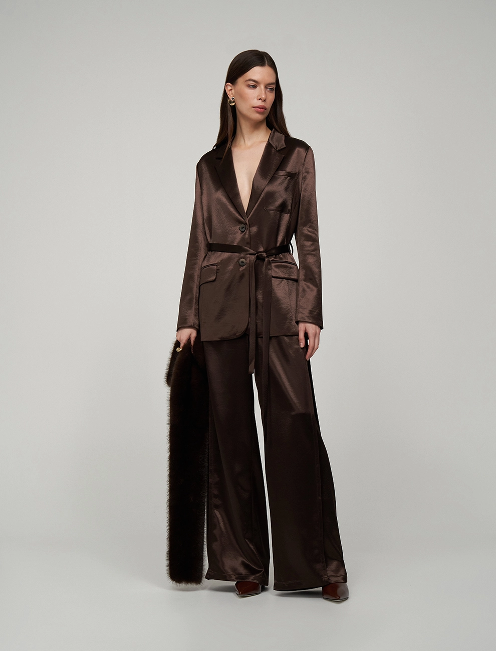 Однобортный жакет прямого силуэта. По передней части изделия — лацканы, нагрудный накладной карман и два кармана с клапанами. В комплекте к жакету идет пояс. Выполнен из полиэстера (82%), вискозы и шелка, что позволяет сохранять гладкий, глянцевый вид и эффект жидкого металла. Представлен в коричневом оттенке.