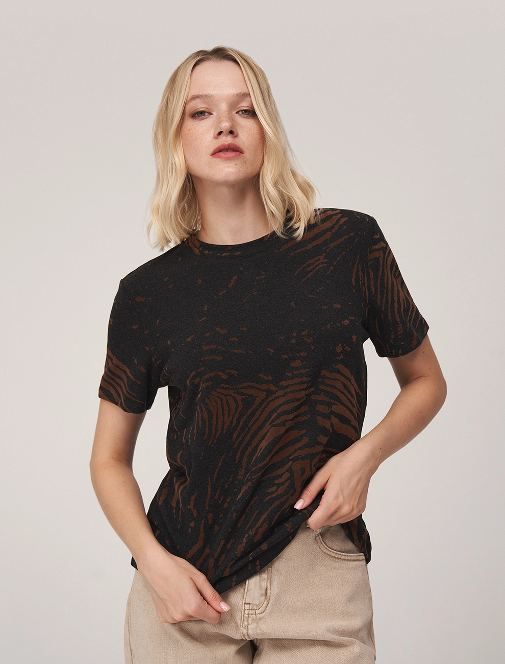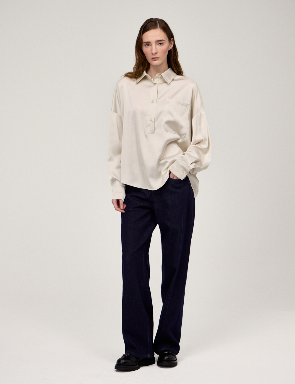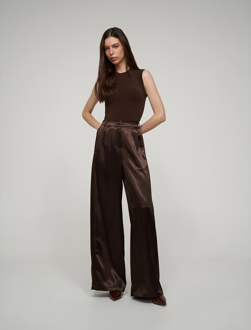 Однобортный жакет прямого силуэта. По передней части изделия — лацканы, нагрудный накладной карман и два кармана с клапанами. В комплекте к жакету идет пояс. Выполнен из полиэстера (82%), вискозы и шелка, что позволяет сохранять гладкий, глянцевый вид и эффект жидкого металла. Представлен в коричневом оттенке.